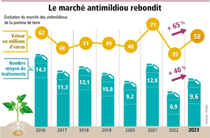 Après deux années aux tendances extrêmes, « la saison 2023 est revenue dans les normes pour le marché des fongicides pommes de terre », décrit Anne Giroud, de Philagro. La pression du mildiou a progressé à partir du 20 juillet, date à laquelle les pluies estivales sont arrivées. Les applications de produits sont donc intervenues davantage en fin de croissance active et en végétation stabilisée plutôt qu’en début de croissance, ce qui a favorisé les produits de fin de cycle. Au final, le nombre de passages par hectare atteint en moyenne 9,6 en 2023 contre seulement 6,9 en 2022, année très sèche. Mais le niveau de 2021 n’est pas atteint (12,8 passages du fait d’une très forte pression du mildiou).