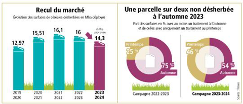 Les précipitations tombées à partir du mois d’octobre 2023 n’ont pas permis de semer la totalité de la sole prévue en céréales d’hiver. Les surfaces reculent ainsi de 11 % en 2023-2024 par rapport à la campagne précédente, à 6 Mha. Cette baisse atteint également 11 % pour le blé tendre (4,2 Mha). Les stratégies de désherbage des agriculteurs ont ensuite été bouleversées par le mauvais temps persistant. « Environ une parcelle sur deux n’a pas du tout été désherbée à l’automne », révèle Laurent Magnant (Ascenza). « La prélevée a pu être réalisée assez correctement, contrairement aux passages en postlevée précoce qui ont été compliqués à positionner et sont réduits de moitié par rapport à l’automne 2022 », note de son côté Alice Nolli (Bayer CropScience). Au total, plus de 1,5 Mha n’ont pas pu être traités à cette période par rapport aux campagnes précédentes. Une partie des produits d’automne a été appliquée en janvier, à la faveur d’une fenêtre météo plus favorable. Les rattrapages au printemps ont aussi été compliqués. Si bien qu’au final, « un grand nombre de parcelles sont infestées de graminées qu’il faudra gérer la campagne prochaine », indique Emilie Ardissone (BASF).