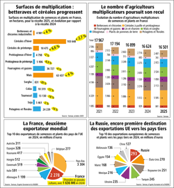 Selon les chiffres de Semae, la France demeure le premier exportateur mondial de semences de grandes cultures pour l’année civile 2024 (1 636 M€) grâce au maïs (800 M€) et aux oléagineux (455 M€). Au niveau global, toutes semences confondues, elle se maintient à la deuxième place (lire ci-contre) avec 2 278 M€ de chiffre d’affaires à l’export (+ 4,4 %), derrière les Pays-Bas. Ces derniers sont le leader mondial des exports de semences et plants en 2024 pour un total de 3 304 M€ (+ 8,3 % par rapport à 2023), portés par les potagères fines et les plants de pomme de terre. L’Allemagne, leader mondial des semences de betterave, est à la 3e place avec un total exporté de 1 199 M€ (+ 8,9 %), devant les États-Unis dont les exportations régressent de 2,3 % à 1 540 M€. En 5e position arrive l’Italie, à 591 M€ (+ 19 %). Le pays est le deuxième producteur européen de semences fourragères (principalement des légumineuses à petites graines).