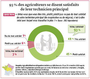 93 % des agriculteurs interrogés dans notre enquête Agrodistribution-ADquation se disent satisfaits de leur technicien principal (jusqu’à 98 % dans le Nord-Est !). Si cette proportion est en légère baisse par rapport à 2022 (97 %), la part des agriculteurs qui se disent « très satisfaits » a grimpé de 15 points pour représenter 48 % des personnes interrogées.