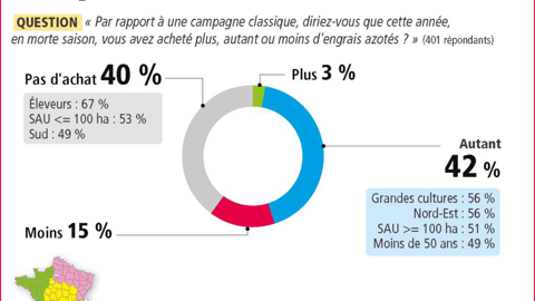 Après deux années compliquées en raison d’une hausse très forte des prix des engrais, les agriculteurs ont repris une tendance d’achat à la morte-saison plus traditionnelle cette année. D’après notre baromètre Agrodistribution-ADquation, 60 % d’entre eux ont acheté des engrais azotés à la morte-saison, contre 54 % en 2023 et 52 % en 2022. Et parmi eux, deux sur cinq assurent avoir acheté autant d’engrais que lors d’une campagne classique. Ce sont principalement des exploitants en grandes cultures (56 %), des producteurs du nord-est de la France (56 %) ou encore des agriculteurs ayant une SAU supérieure à 100 ha.