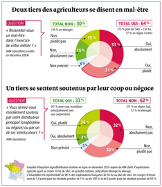 Deux agriculteurs sur trois estiment ressentir un mal-être dans l’exercice de leur métier, selon notre dernier baromètre Agrodistribution-ADquation réalisé en décembre auprès de 484 exploitants agricoles. Et un tiers l’affirment « absolument ». Un mal-être surtout ressenti dans le Centre (pour 77 % des sondés de cette région), les exploitations de plus de 150 ha (72 %) et en grandes cultures (70 %), alors que le Sud et les éleveurs semblent moins affectés avec 58 % des sondés touchés.