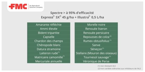 L’association Express® SX® + Illustra® est efficace sur chardon des champs, renouée liseron et une large flore dicotylédones annuelles et vivaces. Fractionnement possible (voir recommandations FMC).