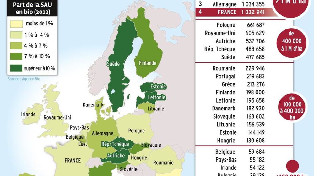 D'après l'Agence Bio, malgré ses 1 032 941 ha en bio ou en conversion, la France se place en dix-septième position du palmarès européen pour sa part de SAU en bio, avec 3,82 % en 2012. Sans surprise, les grandes cultures en France arrivent dernières : 1,7 % des surfaces sont en bio ou en conversion. Un chiffre qui monte à 8,2 % pour la viticulture, et 13 % pour les productions de fruits.