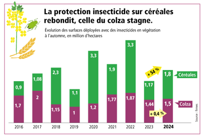 La progression du marché des insecticides à l’automne 2024 a été portée par les traitements des céréales d’hiver qui ont crû de 54 % par rapport à l’automne 2023, à 1,8 Mha déployés. Première raison : il y a eu davantage de surfaces à traiter (6,4 Mha de céréales d’hiver contre 6 Mha la campagne précédente). Et la pression des pucerons a été plus importante qu’en 2023, notamment en début de campagne. Mais on est encore loin des 3,3 Mha déployés de 2022. Le nombre de passages sur céréales reste équivalent à 2023, à 1,04 en moyenne. Un chiffre assez faible par rapport à il y a quelques années où il atteignait 1,2-1,3. En termes de coût par passage, le chiffre est aussi stable, entre 4 et 4,50 €/ha.