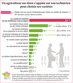 Choisir une variété suppose de composer avec les contraintes pédoclimatiques, la rentabilité, les exigences des débouchés, les aléas météorologiques et l’innovation variétale. Dans ce flux d’informations, il n’est pas toujours évident d’identifier la génétique la plus adaptée à son exploitation. Alors pour faire le bon choix, les agriculteurs se tournent vers un interlocuteur privilégié : leur technicien. C’est ce que révèle notre baromètre Agrodistribution-ADquation : un agriculteur sur deux (51 %) s’appuie sur les conseils du technicien de son distributeur pour choisir ses variétés de semences, laissant loin derrière les résultats d’essais d’instituts techniques (22 %), les réunions techniques (11 à 16 %) ou encore les sites des semenciers (5 %). « Ce n’est pas surprenant, commente Béatrice Petit, déléguée générale Semae Sud-Est. Le conseiller est en lien direct avec l’agriculteur. »